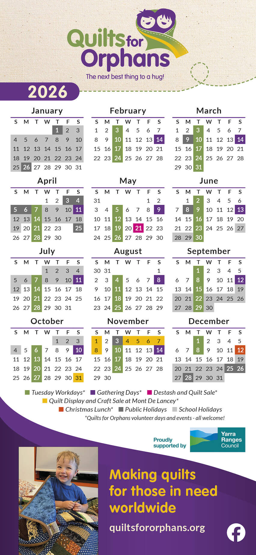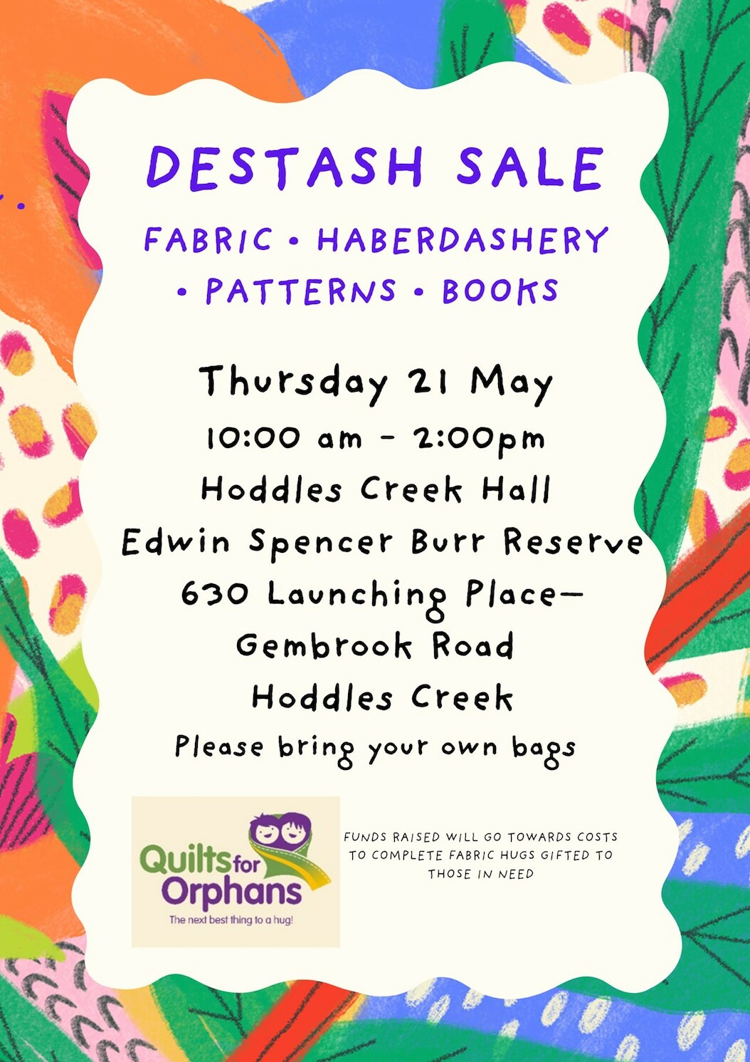We meet at the Hoddles Creek Hall on Tuesdays, (except for Cup Day), and the second Saturday of the month from February to October, from 9.30 am to 3 pm. Please note on EXTREME and CATASTROPHIC Fire Danger Days (including Total Fire Ban Days) for the CENTRAL region, our activities at the hall will be cancelled.