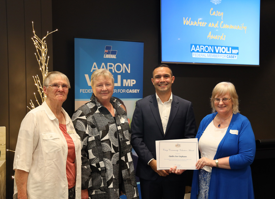 Since 2007, over 6500 QFO fabric hugs have been given locally to emergency relief, family, refugee and domestic violence organisations, aged care homes, hospitals, and globally. We have several fundraising events during the year to cover our costs, including rental of the hall, insurances, energy bills and the purchase of thread, batting and backing fabric. In December 2023, we were proud to receive a Casey Volunteer Award from Aaron Violi, MP.